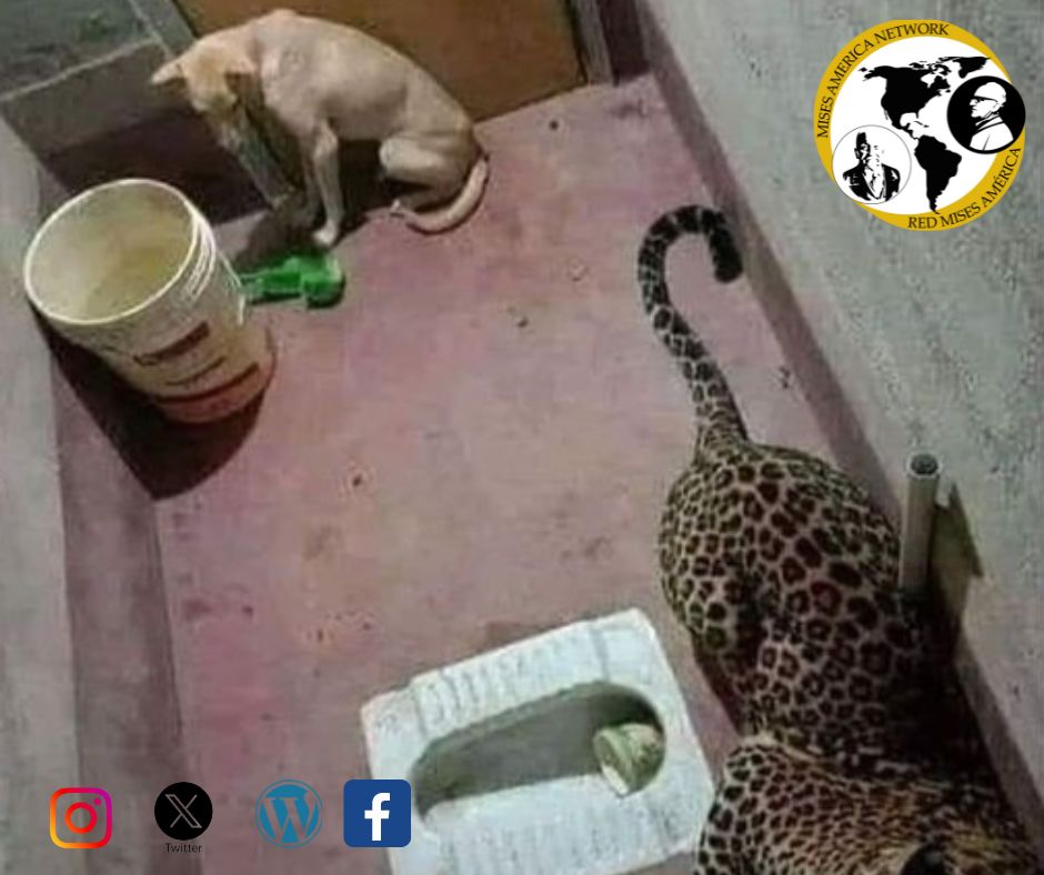 El leopardo entró detrás del perro y ambos quedaron atrapados en el inodoro; cuando el perro vio al leopardo, entró en pánico y se sentó en silencio en un rincón.
