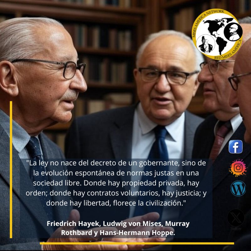 Friedrich Hayek: "La ley no se diseña, sino que evoluciona". En un entorno libre, las normas jurídicas emergerían mediante la costumbre, la reputación y la competencia entre tribunales privados.