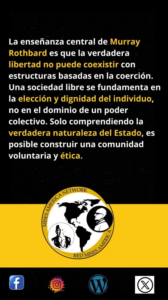 Desde esta perspectiva, es crucial entender que el Estado no es la sociedad. Confundirlos es conceder al poder político una legitimidad que no tiene. Como afirma MurrayRothbard , “el Estado no somos nosotros”. No es una cooperativa ni una comunidad solidaria; es una estructura jerárquica que vive del fruto del trabajo ajeno mediante mecanismos como impuestos, regulación forzada y monopolios legales.