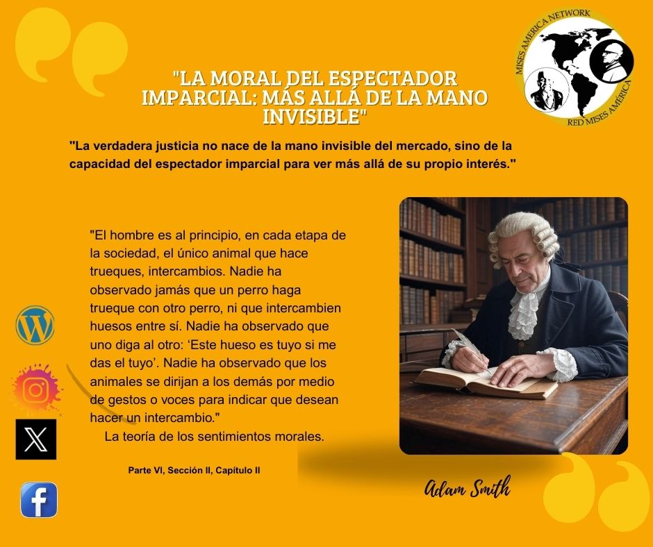 En La teoría de los sentimientos morales, Adam Smith introduce el concepto del espectador imparcial como una figura interna que regula nuestra moralidad, juzgando nuestras acciones desde una perspectiva objetiva y desapasionada. Este espectador idealizado, que representa un estándar moral socialmente compartido, permite a los individuos ajustar su comportamiento a lo que sería aprobado por una conciencia pública imparcial. Por otro lado, la mano invisible ilustra cómo, al perseguir intereses personales, los individuos pueden contribuir, sin intención directa, al bienestar colectivo. Sin embargo, ambos conceptos tienen límites claros: el juicio moral del espectador imparcial puede verse influenciado por normas culturales y, la mano invisible, aunque eficaz en el mercado, no garantiza resultados justos ni equitativos, sobre todo si no está mediada por principios de benevolencia y justicia. En palabras de Smith: "No es la benevolencia del carnicero, del cervecero o del panadero la que nos proporciona nuestra comida, sino su propio interés" (Smith, La riqueza de las naciones), subrayando cómo, incluso en un sistema de intereses personales, pueden surgir beneficios para la sociedad, pero siempre con la necesidad de regulación moral y ética.