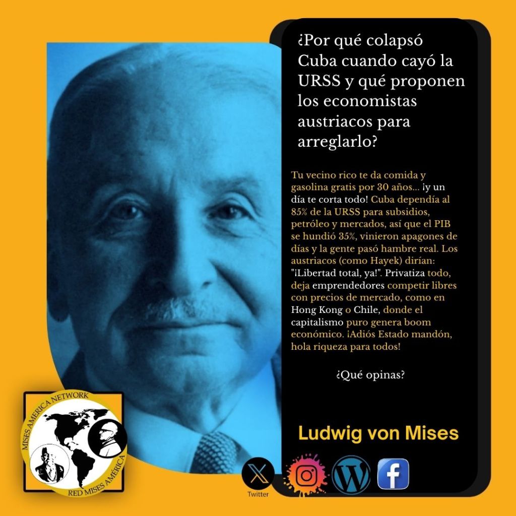 ¿Por qué colapsó Cuba cuando cayó la URSS y qué proponen los economistas austriacos para arreglarlo? Publicado el 30 de marzo, 2026 por lucremc Comparte esto: Compartir en X (Se abre en una ventana nueva) X Comparte en Facebook (Se abre en una ventana nueva) Facebook Más Enviar un enlace a un amigo por correo electrónico (Se abre en una ventana nueva) Correo electrónico Me gusta Cargando... Publicado por lucremc Ver todas las entradas de lucremc